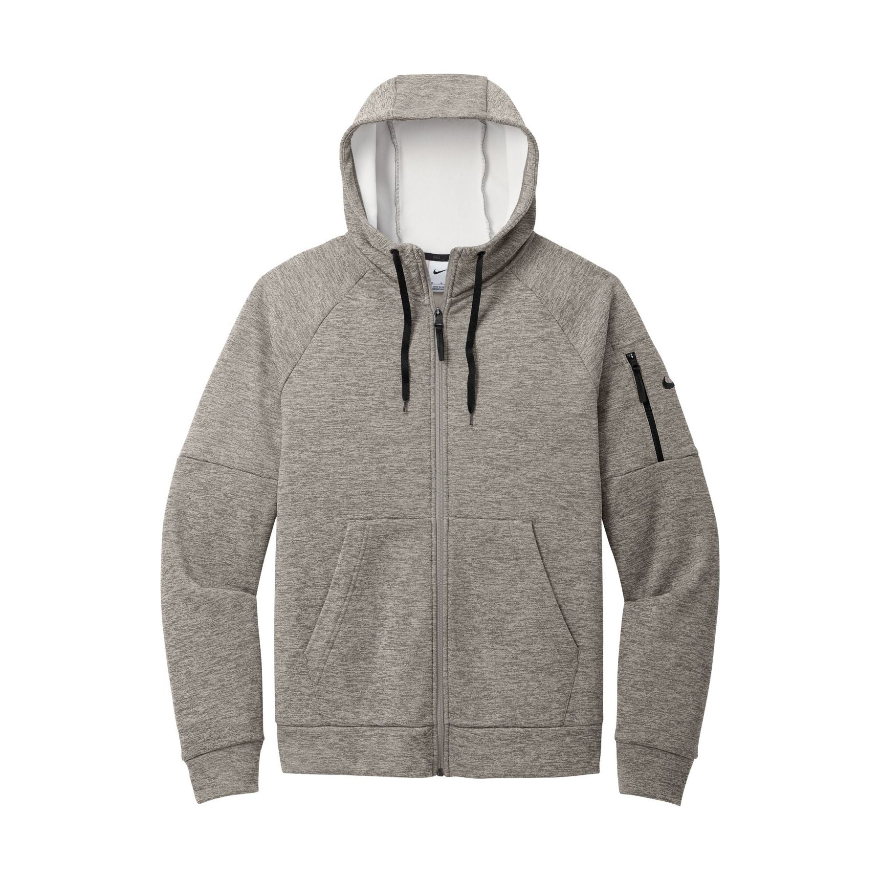 This full-zip hoodie with a zippered left arm pocket brings the heat to your workout with Therma-FIT fabric. Therma-FIT helps manage your body's natural heat to keep warm in cold-weather conditions. The design includes a three-panel hood with black drawcords, a dyed-to-match zipper and front pockets. Self-fabric cuffs and hem. A contrast Swoosh logo is embroidered on left sleeve. A contrast Therma-FIT logo is embroidered on back hem. Made of 7.4-ounce polyester Therma-FIT fabric with at least 50% recycled and/or organic content.